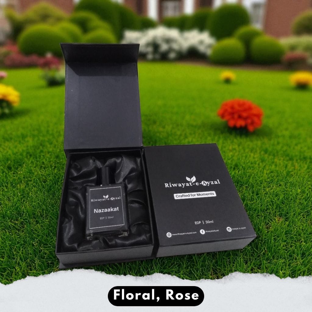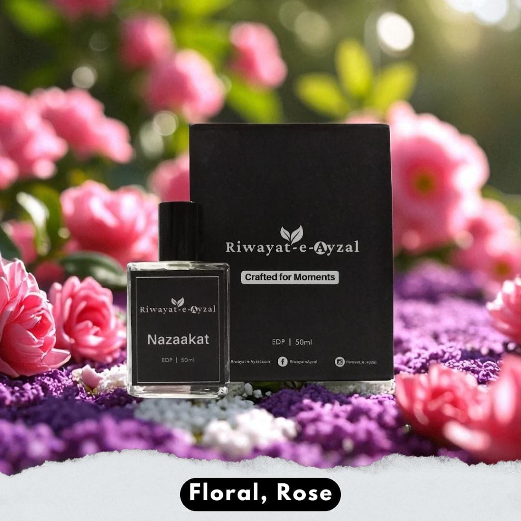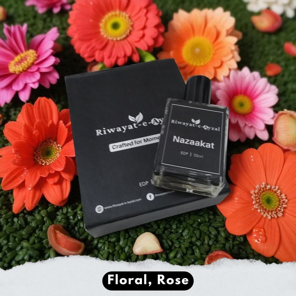 Nazaakat is a celebration of grace and joy, evoking the feeling of walking through a blooming garden. With bright citrus and peony notes, it blossoms into a heart of roses and osmanthus, exuding timeless elegance. A warm base of patchouli and sandalwood and a hint of brown sugar add richness and charm. Perfect for free-spirited women, this fragrance radiates positivity and effortless beauty.